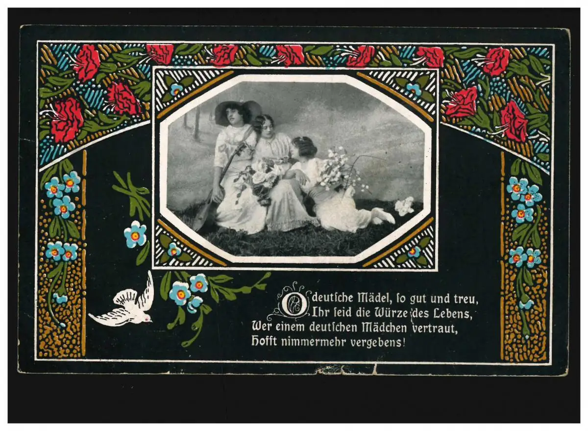 AK Femmes: Femmes couchées Fleurs Guitare, Oh Allemande fille, marquée 1917
