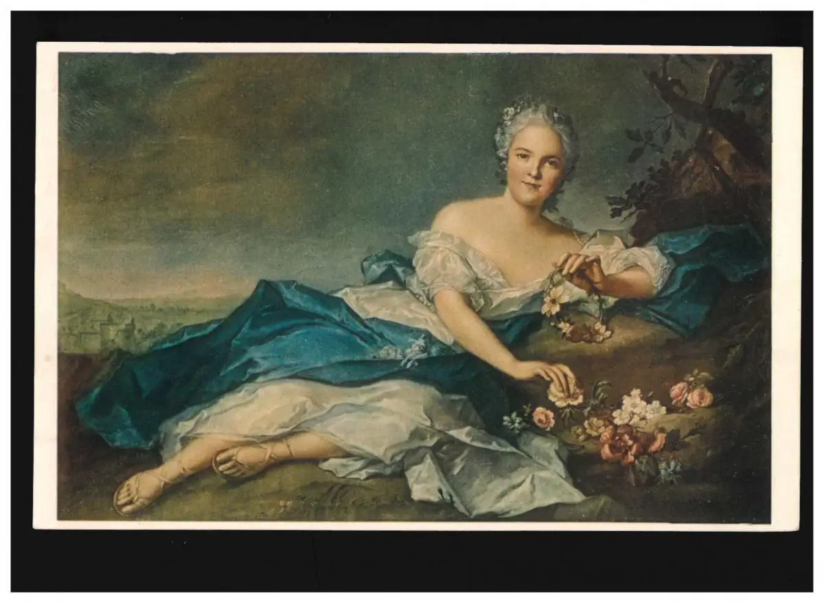 AK Femmes: femme couchée, avec un vêtement bleu blanc, couronne de fleurs, non utilisé