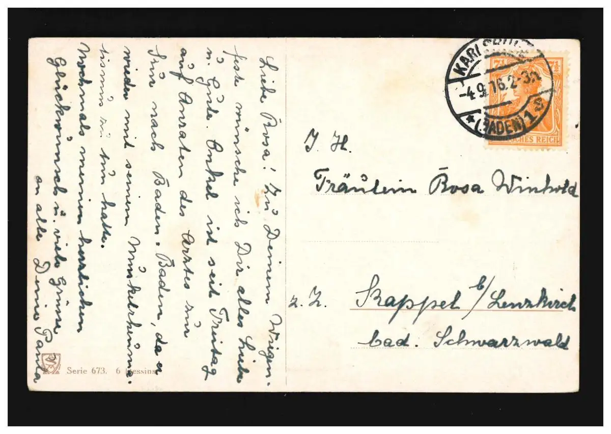 AK Fleurs bouquet jaune fleurs roses vase M. Davil Passepartout, Karlsruhe 4.9.1916