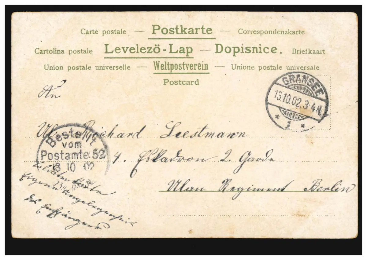 de GRANSEE 13.1.1902 selon BERLIN "commandé par le bureau de poste 52 - 13.10.02" à la 4ème escadron du 2ème régiment d'Ulan à Berlin Examen: original Référence de l'article: 00000000037660>Remarque: Cet article n'est disponible qu'une seule fois. Vous recevrez exactement l ' article représenté.