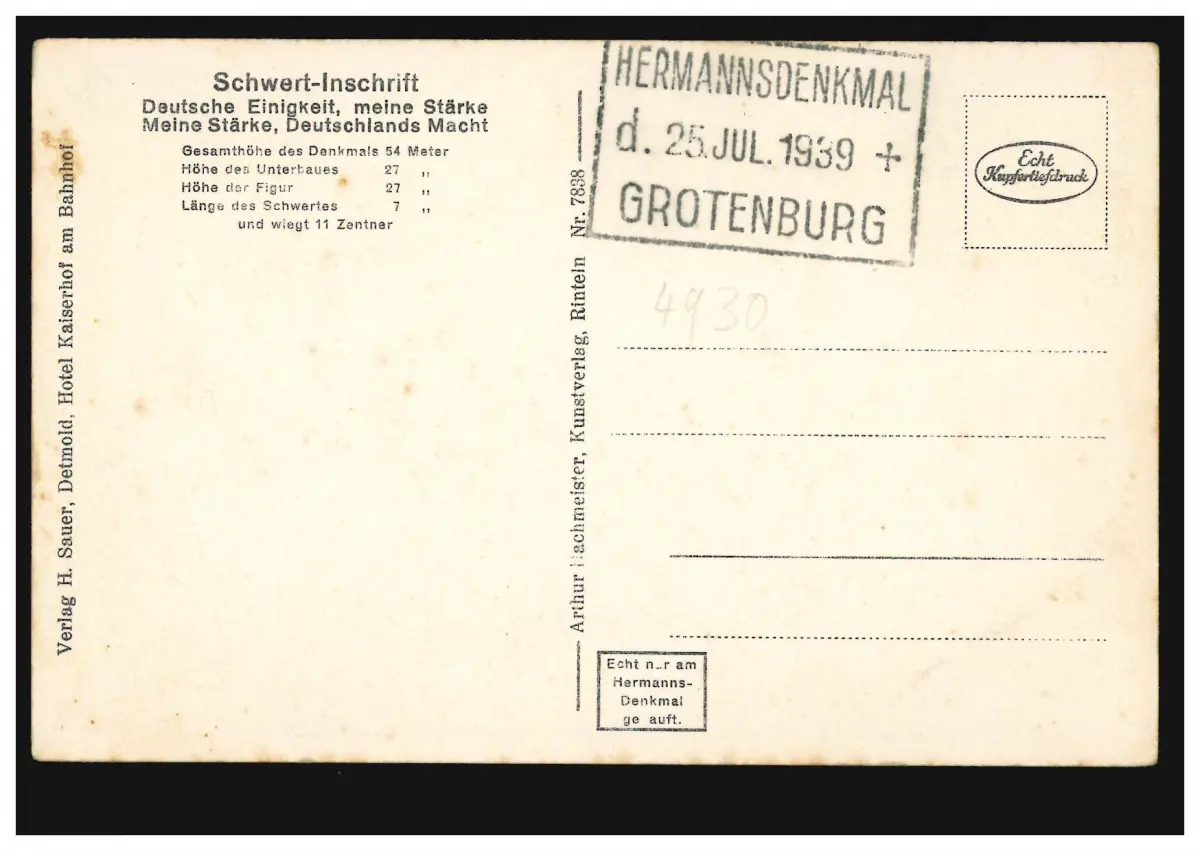 avec le cachet de cadre "HERMANSENKMAL le 25 juillet 1939 GROTENBURG" Vérification: original Référence produit: 00000000016152>p>Remarque: Cet article n'est disponible qu'une seule fois. Vous recevrez exactement l'article représenté.