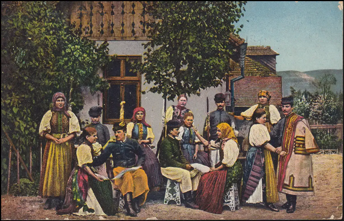 AK Groupe de costumes hongrois: photo de groupe de Huedin / Heynod, poste de terrain 16.3.17