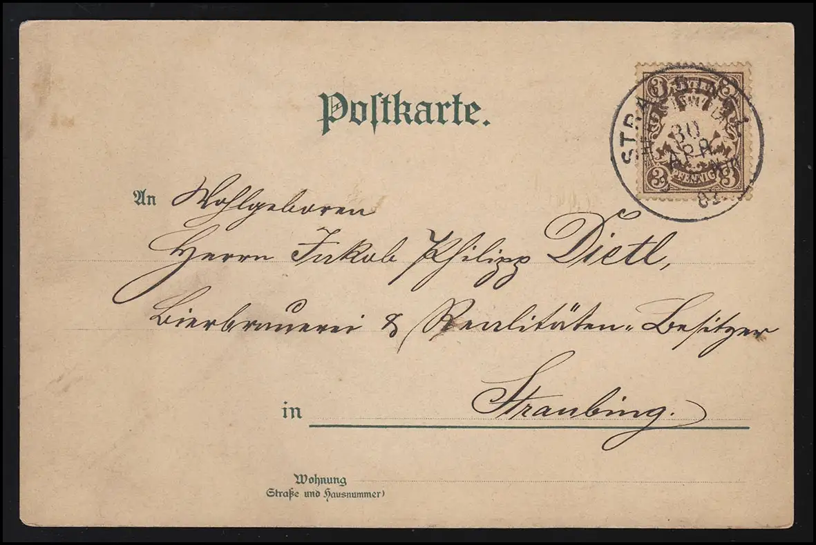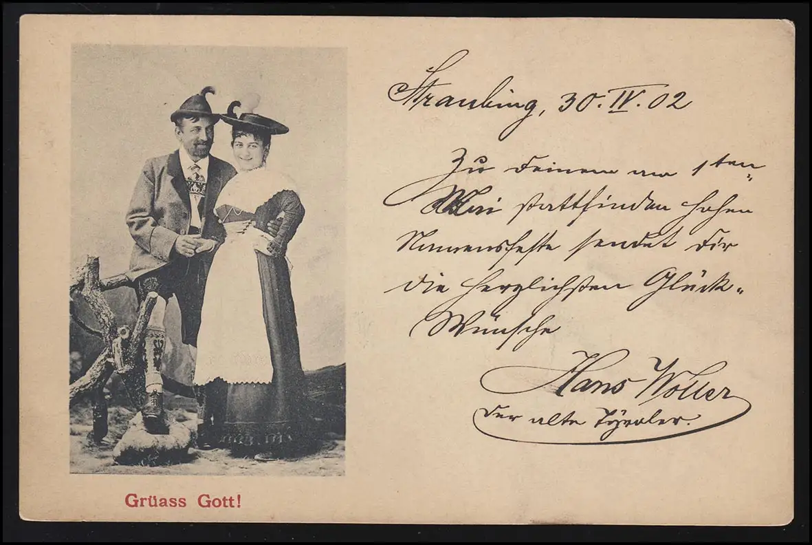 AK Grüss Gott! Couple bavarois Dirndl Gamsbart, STRAUBING 30.4.1902