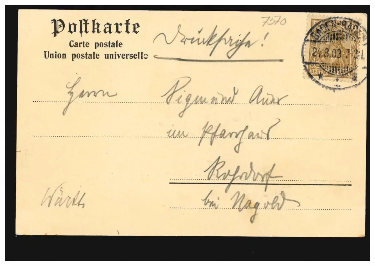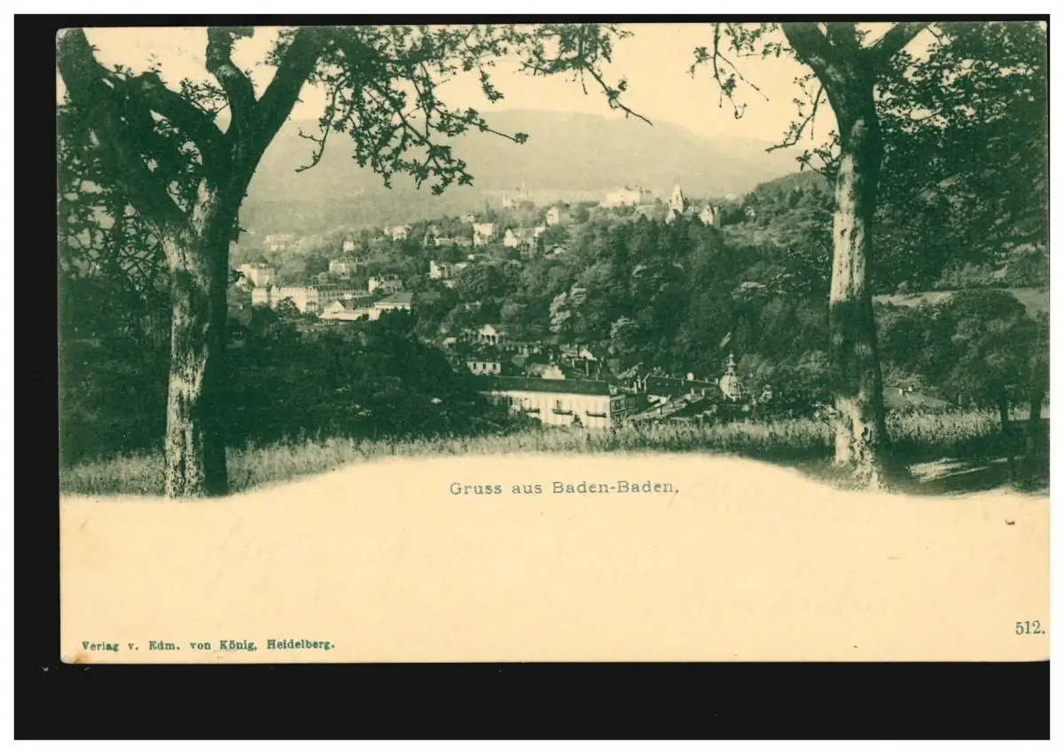 AK Gruss de Baden-Baden: Panorama par deux arbres, maison d'édition Roi, 24.8.103