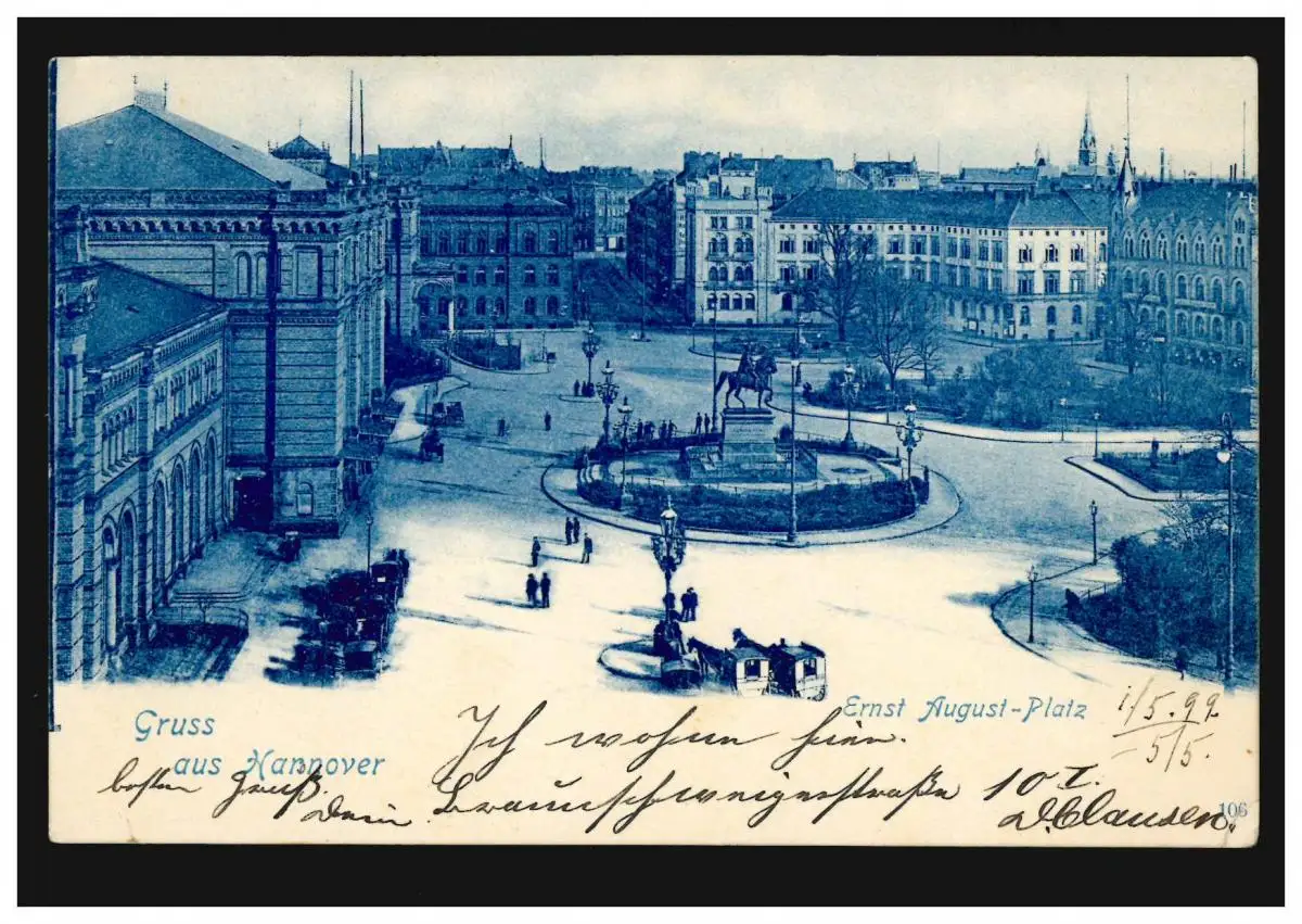 AK Gruss de Hanovre: Ernst-August-Platz, 1.5.1899 selon HAN. Münden 2.5.99