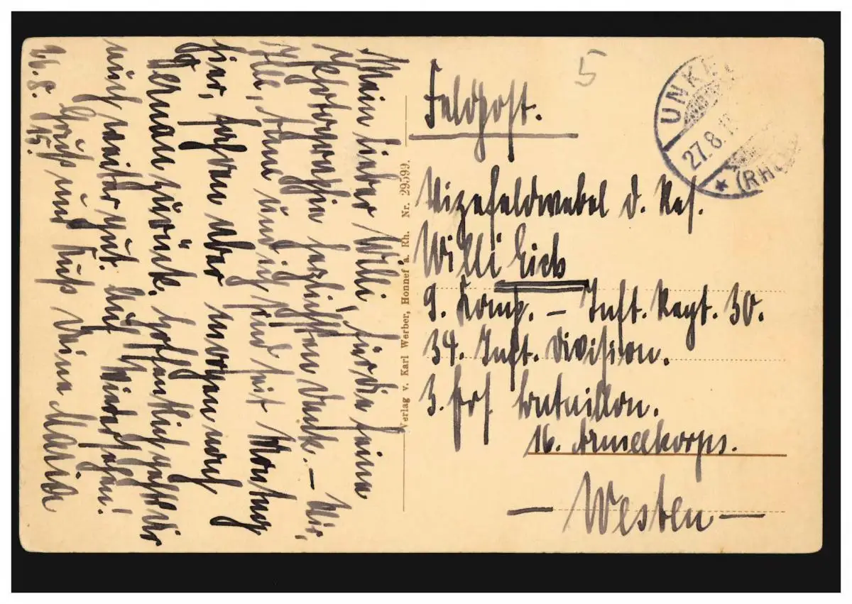 En tant que carte postale de champ UNKEL (RHEIN) 27.8.15 à l'infanterie-régiment 30 Vérification: original Référence produit: 00000000019564
