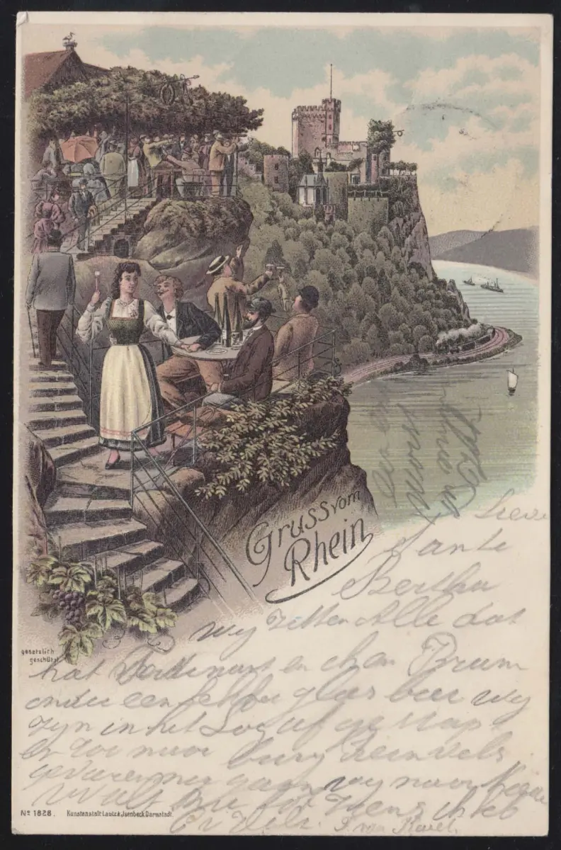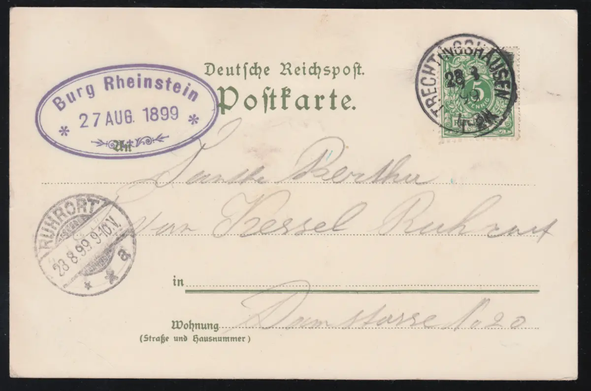 AK Gruss du Rhin: Château de Rheinstein, Trechtingshausen 28.8.99 après RUHRORT 28.8.
