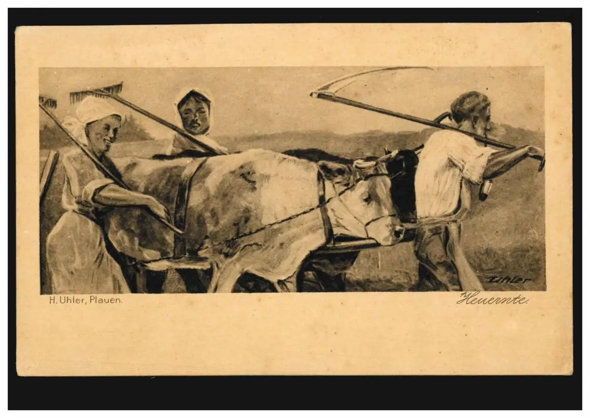 AK H. Uhler: moissonneuse de foin - agriculteurs avec des bovins en raquette, inutilisé