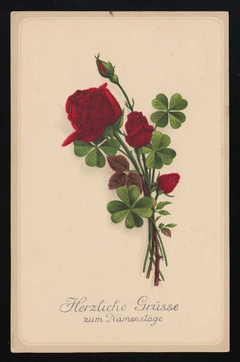 AK H & S B., bouquet Roses rouge foncé, jour du nom, Günd 2.3.1917 vers Ellwangen