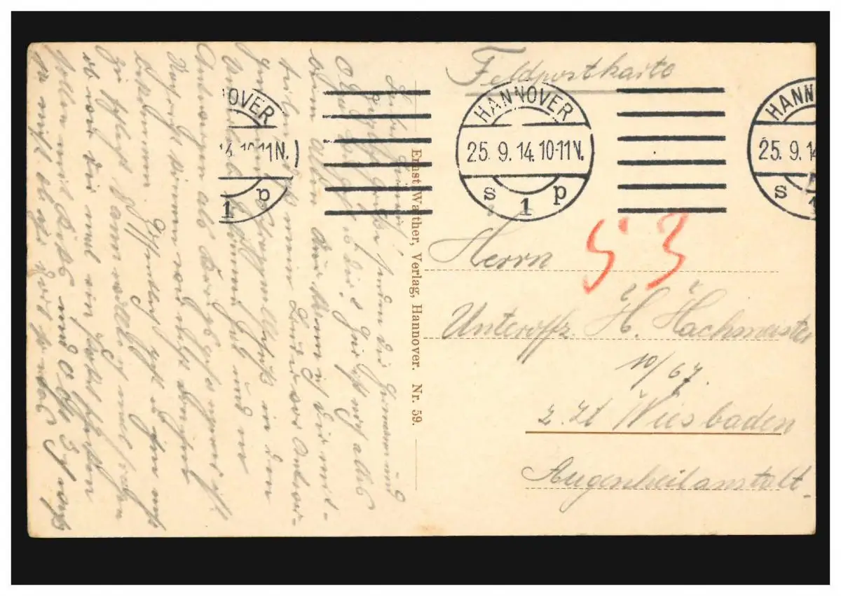 AK Hanovre: Neue Mairie, Feldpost HANNOVER s 1 p 25.9.1914 vers Wiesbaden