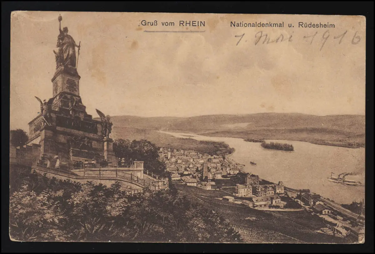 AK K.S.M No 284 Salutation du Rhin GERMANIA RÜDESHEIM Monument AßMANNSHAUSEN 1.5.16