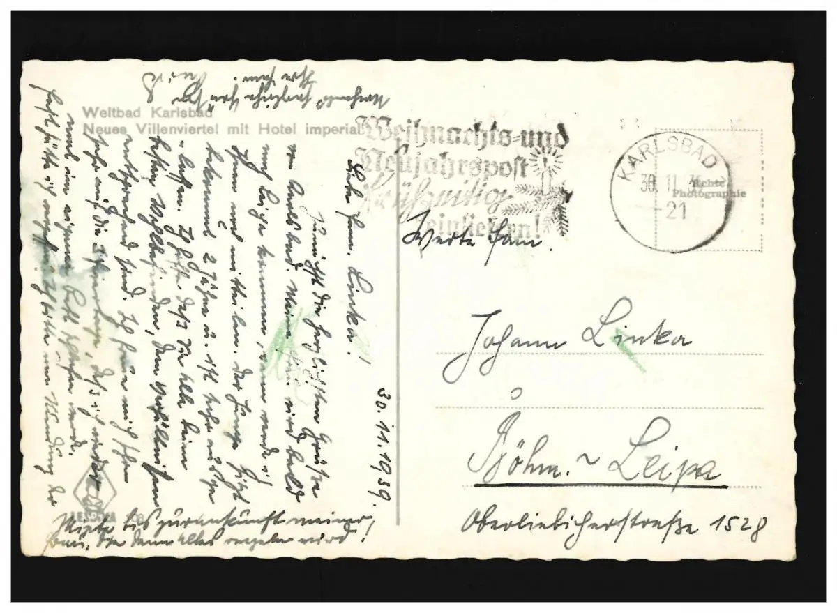 AK Karlovy Vary Villasquarter Hotel Imperial, Post de Noël, Karelsbad 30.11.1939