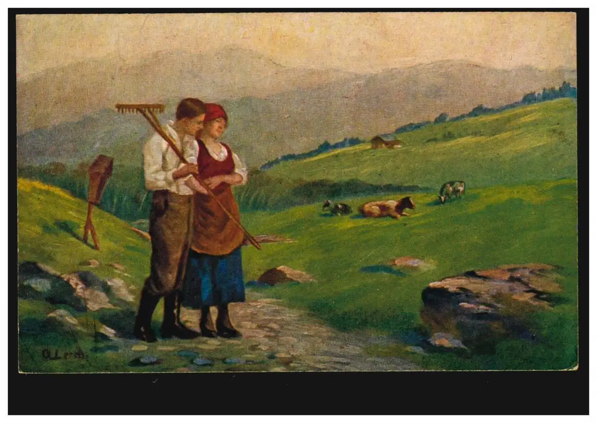 AK Lerch Artiste: Sur la Alm - Paix paysanne avec harke et vaches, inutilisé