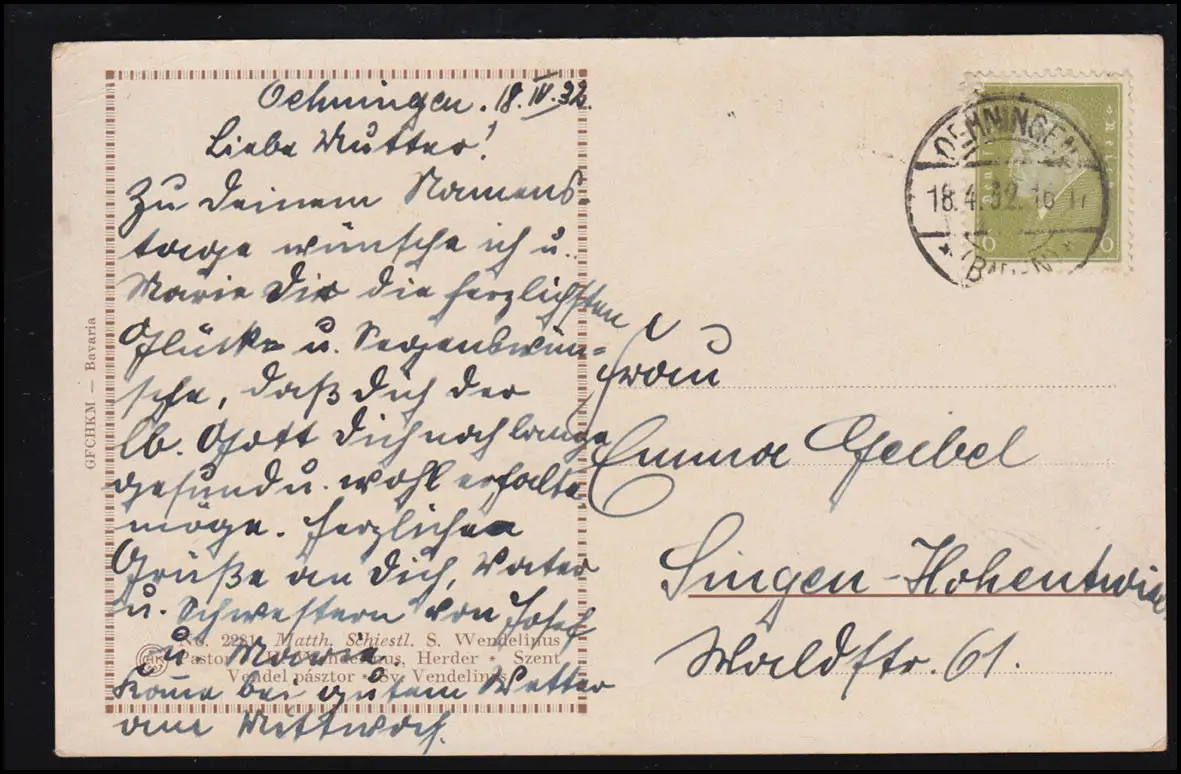 AK Matthieu Schiestl: Le Saint Wendeline priant sur le croix, OEHNINGEN 1932