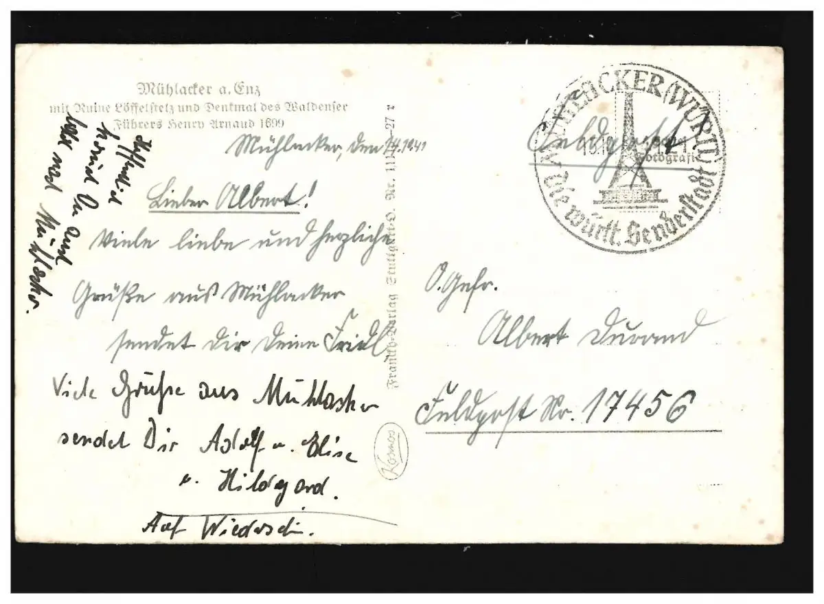 AK Mühlacker Enz Ruine Lödelstelz Monument Henry Arnaud, Müllaker 14.10.1941