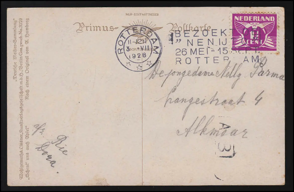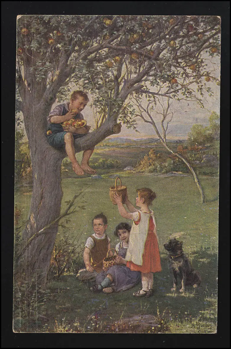 AK NL PRIMUS Enfants + Chien à pomme moissonnant sous un arbre, ROTTERDAM 3.7.1928