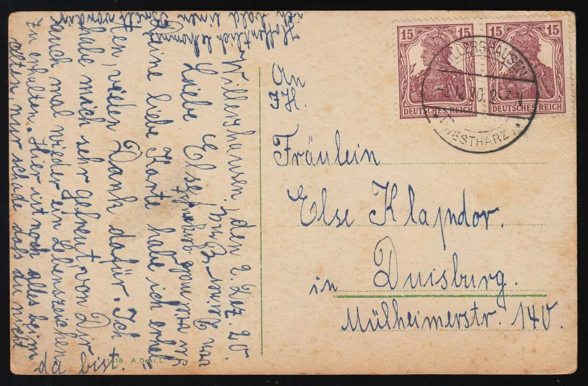 AK No 1418 A.Oehi.L. "Joyeux au revoir" Oeillets sceau, Willershausen 2.12.1920
