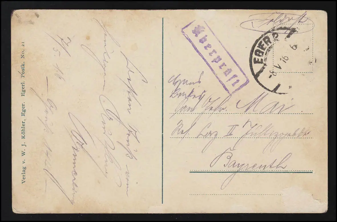 AK No. 21 Salutation EDERLANDE Traitez la censure EGER vers BAYREUTH 8.5.1916
