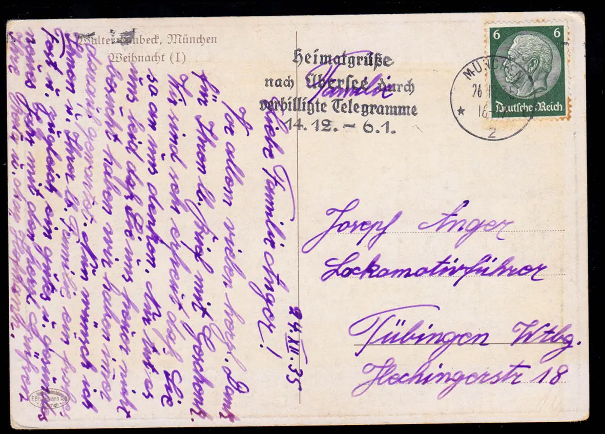 Tampon publicitaire "Salutations à l'étranger par télégrammes à prix réduit 14.12.-6.1." Vérification: original Numéro d'article: 00000000035308