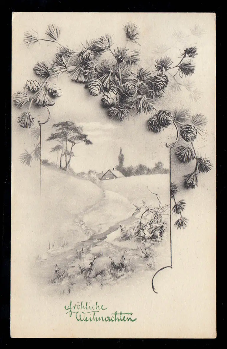 AK Noël: Paysage hivernal dans le cadre de branches avec des cônes, VIENNE 21.12.12