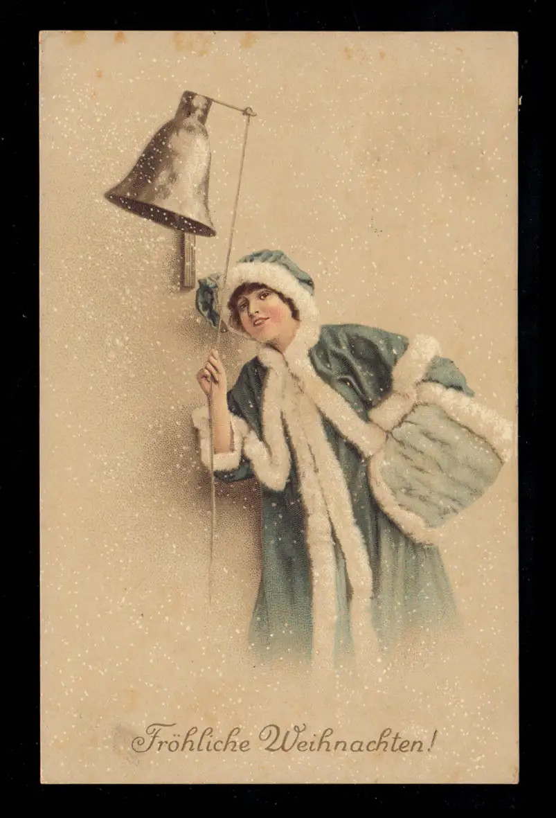 AK Noël: Une femme souriante dans un manteau de fourrure sonne la cloche, HAGEN 24.12.1915