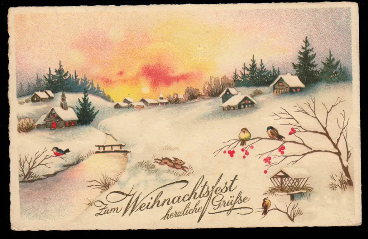 AK Noël: Villageidylle Lever du soleil Pont Oiseaux Pèlerins, inutilisé