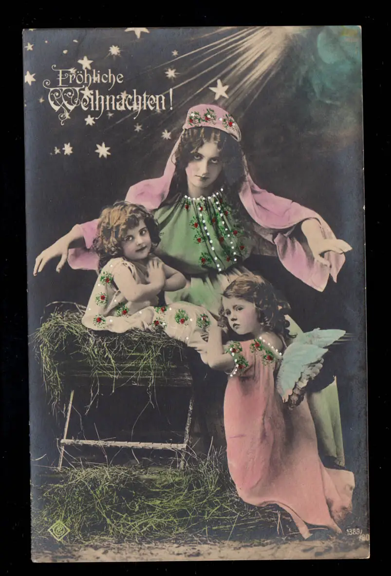 AK Noël: femme avec deux filles au jeu de crèche, colorée, marquée