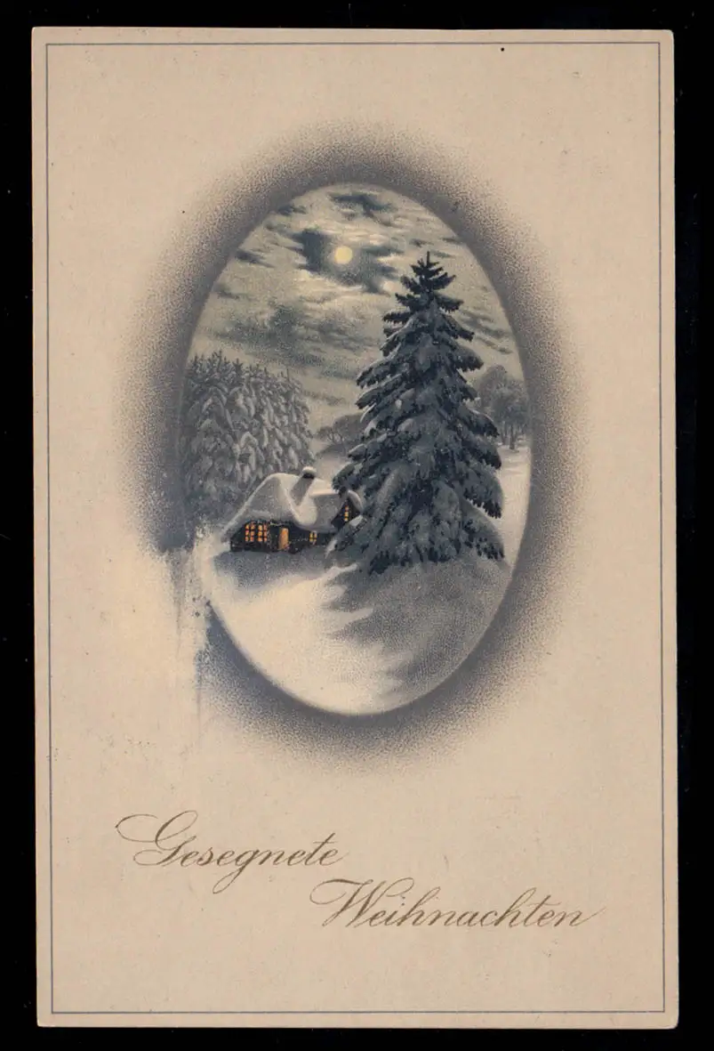 AK Noël: paysage d'hiver en ovale avec sapin maison pleine lune, non utilisé
