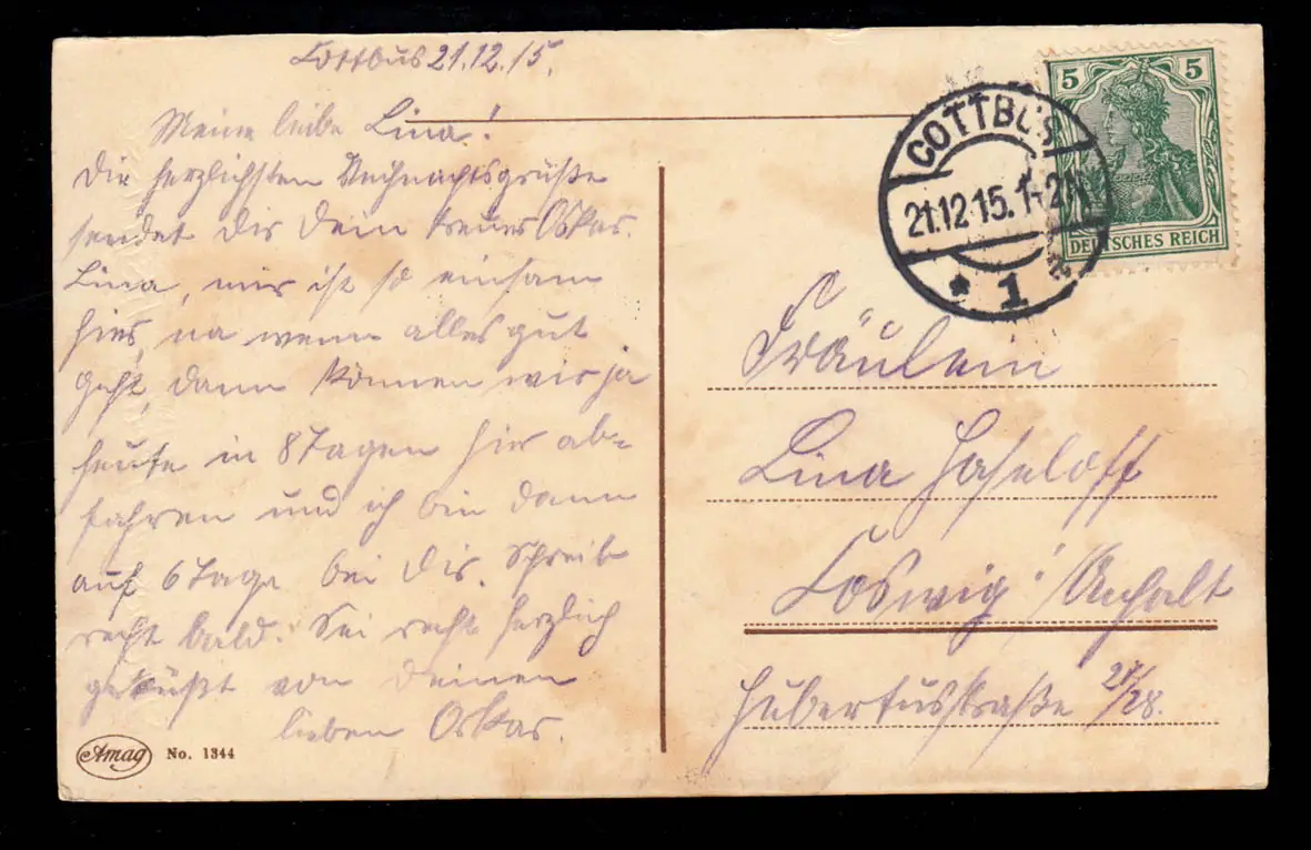 AK Noël: paysage hivernal dans le brouillard, sapin patriotique, COTTBUS 21.12.15