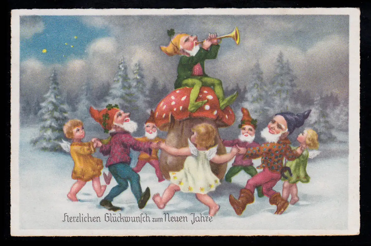 AK Nouvel An: Anges et nains dansent autour de la naine de champignon de mouche avec trompette 31.12.1940