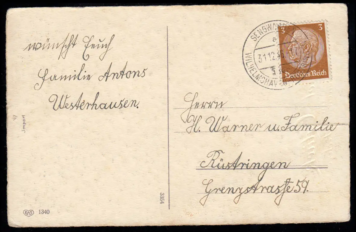 Tampon quotidien SENGWARDEN sur WILHELMSHAVEN-RÜSTRINGEN 31.12.36 Vérification: original Référence produit: 00000000045694>Note: Cet article n'est disponible qu'une seule fois. Vous recevrez exactement l'article représenté.