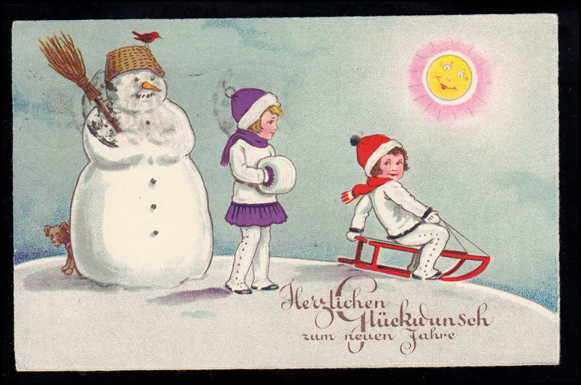 AK Nouvel An: Randonnée en traîneau - Filles Snowmann Chien Soleil,CHEMNITZ 31.12.1929