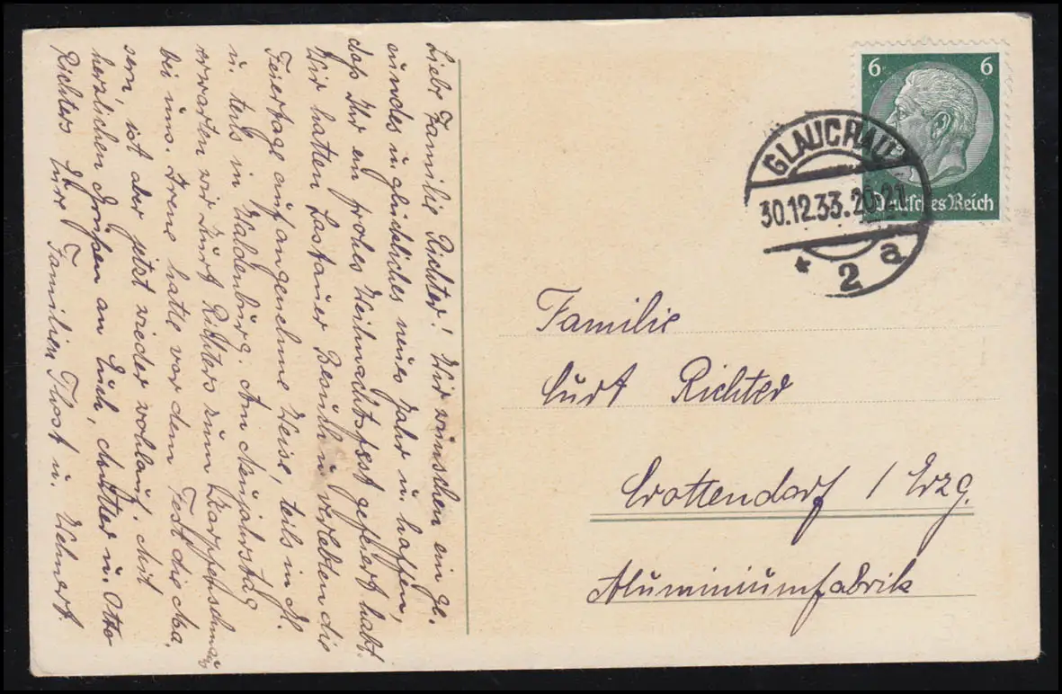 AK Nouvel An: Vue de la vallée sur le village en hiver, GLAUSAU 30.12.1933