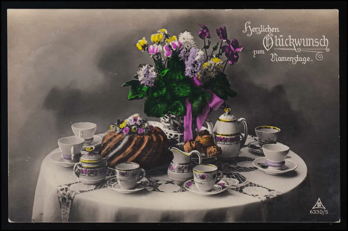 AK PH 6330/5 Tablette de café festive avec gâteau & autruche, jour de nom, 28.9.1931