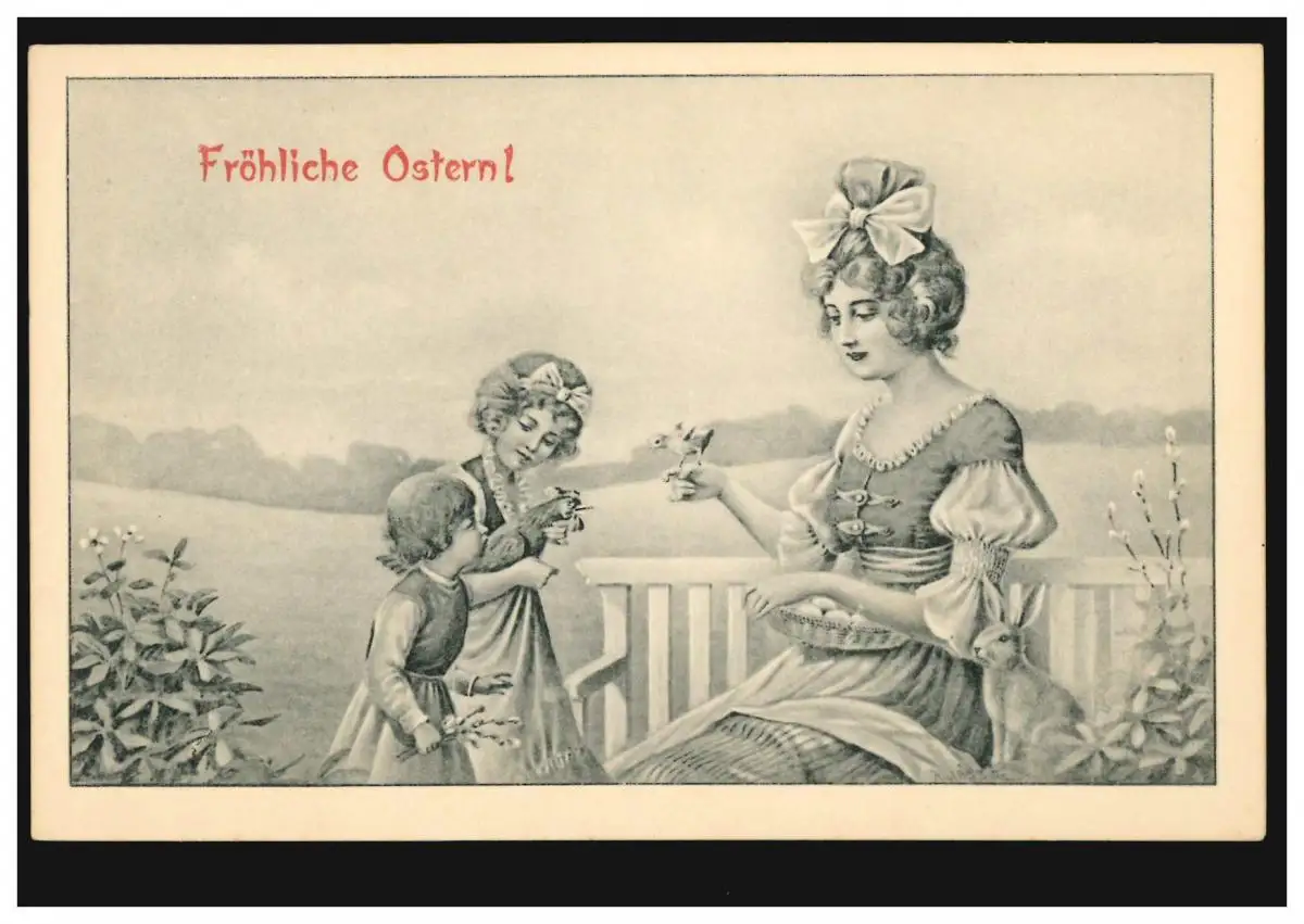 AK Pâques: famille avec poussin et lapin, inutilisé vers 1899