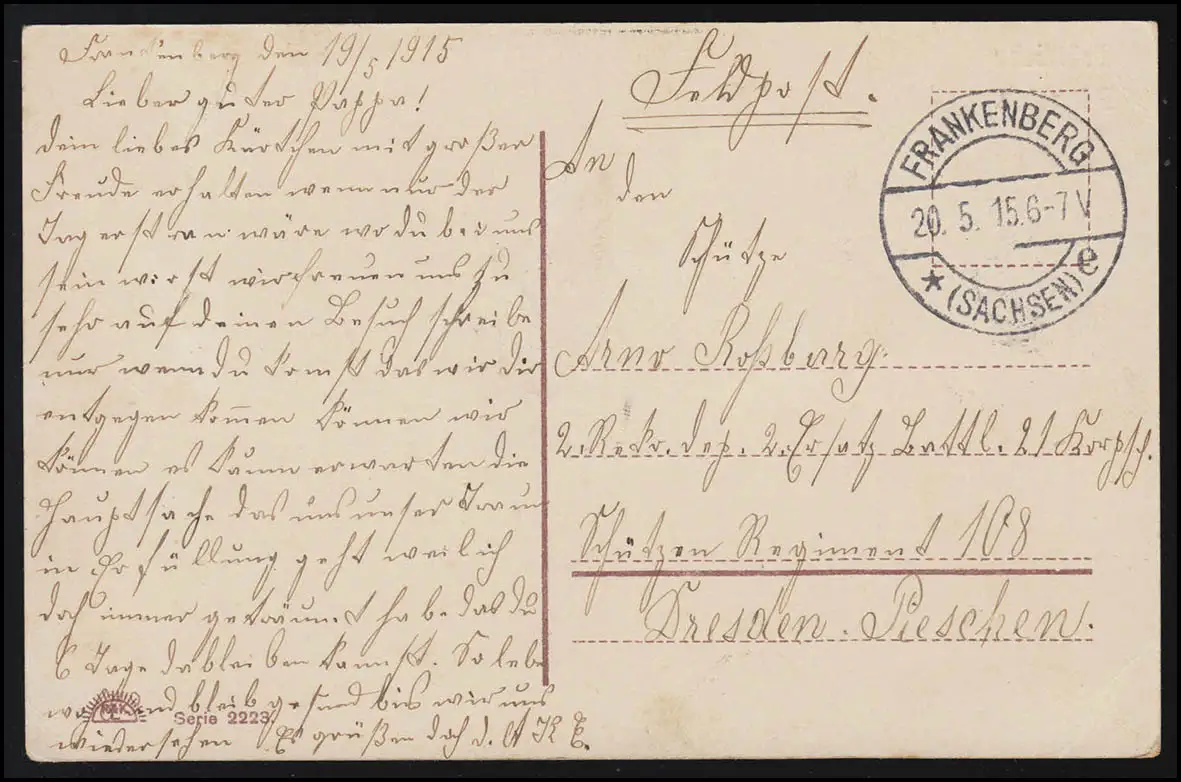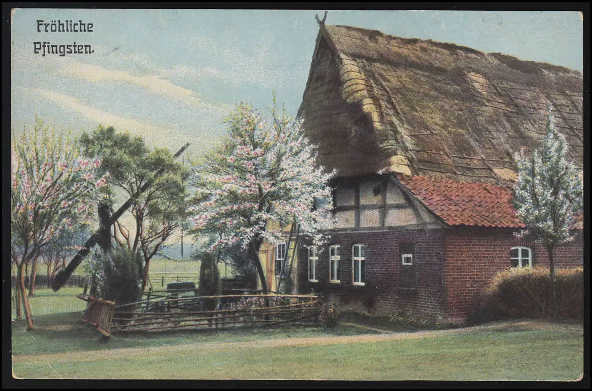 AK Pentecôte: Ferme au printemps, Feldpost FRANKENBERG (Sachsen) 20.5.15