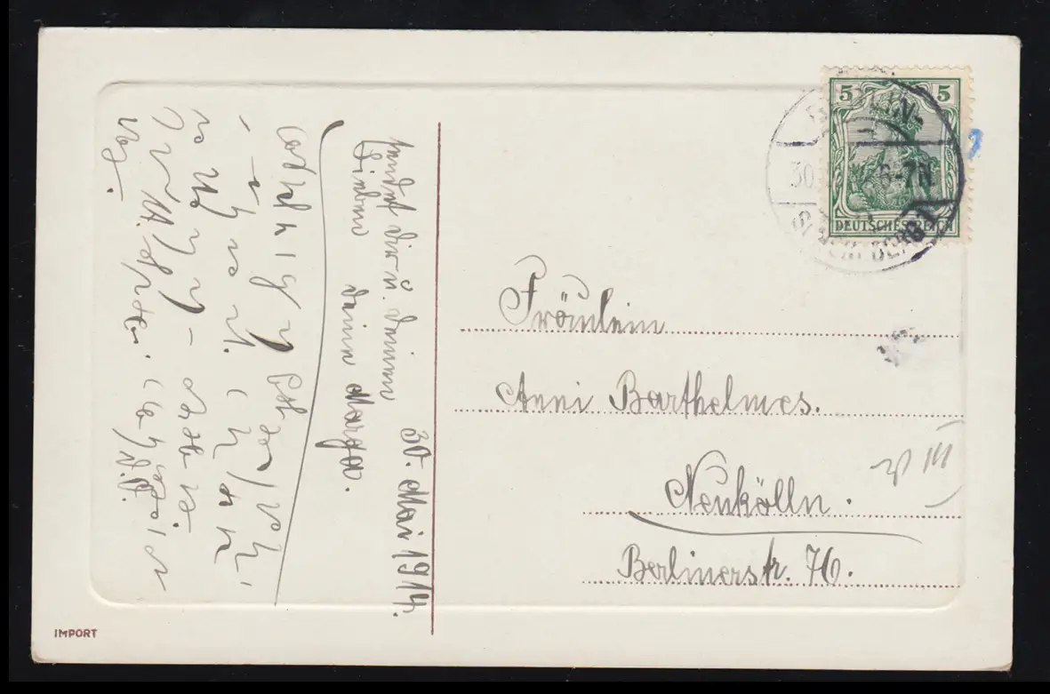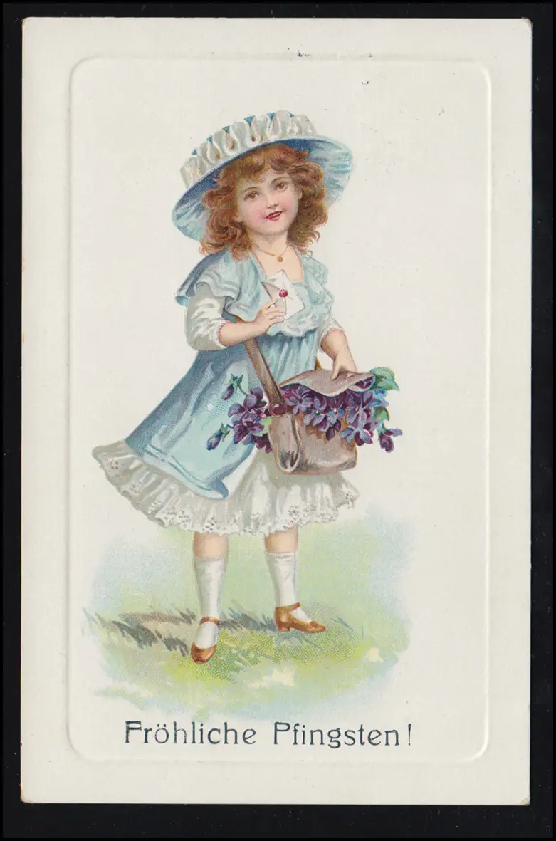 AK Pentecôte: Fille en robe bleue avec chapeau et sac, BERLIN-SCHÖNEBERG 1914