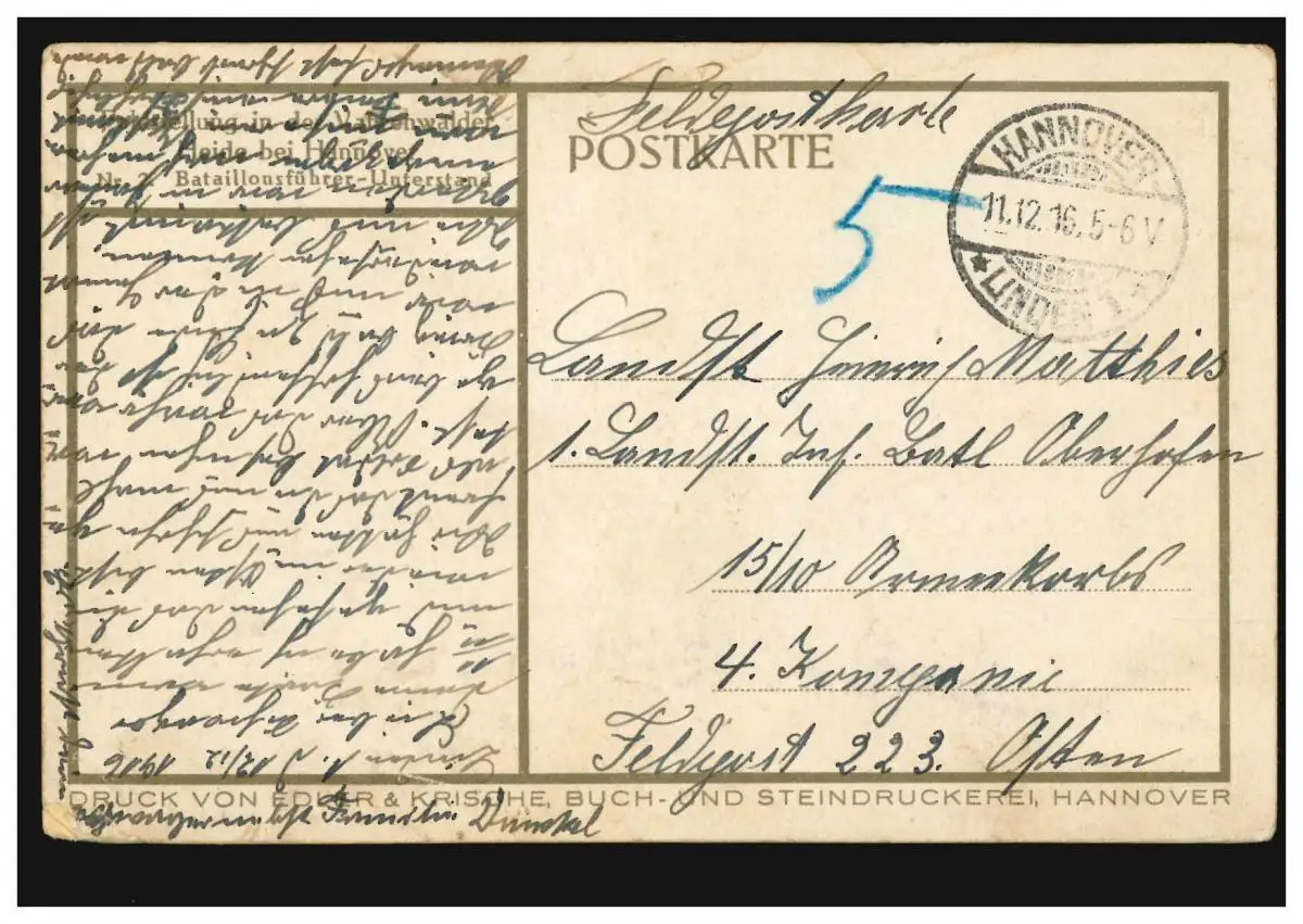 Carte postale de champ HANNOVER-LINDEN 11.12.1916 à Feldpost 223, série photo numéro 2 Vérification: originale Référence produit: 00000000042348