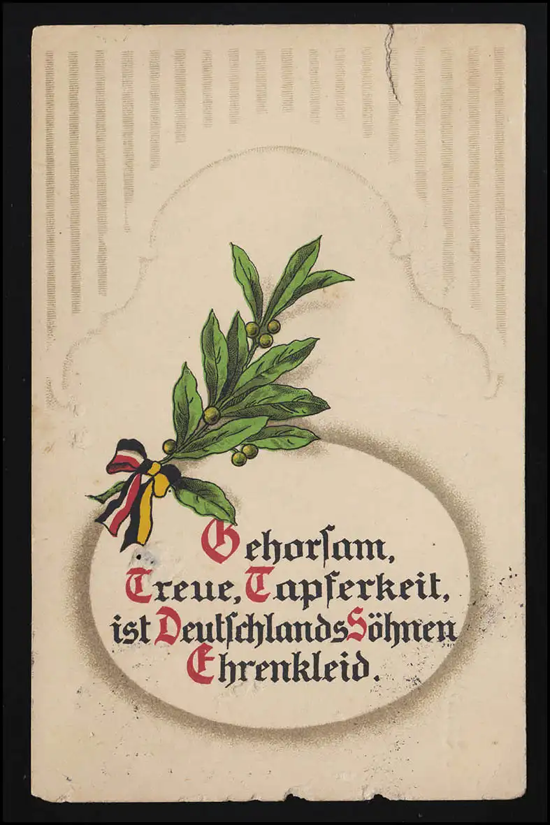 Obéissance, fidélité, courage est une robe d'honneur aux fils allemands. Carte a des marques de craquement au milieu, une fissure au bord supérieur et un petit trou sur " fidélité ." Examen: original Référence produit: 00000000047761>Remarque: Cet article n'est disponible qu'une seule fois. Vous recevrez exactement l'article représenté.