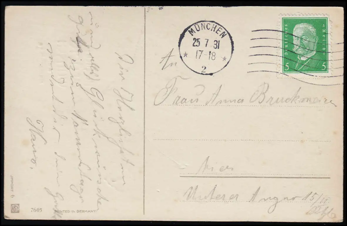AK SB 7603 Vogel apporte lettre dans le bec, jour de nom couronne de fleurs MUNICH 25.7.31