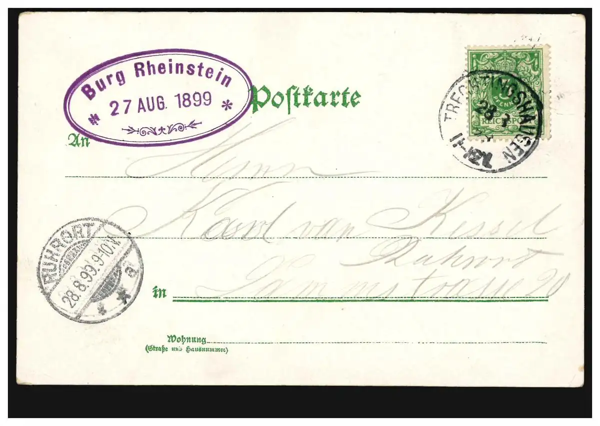 Tampon d'arrivée RUHRORT 28.8.99, Templier violet "Burg Rheinstein 27 août 1899" Vérification: original Référence produit: 00000000037592>p>Note: Cet article n'est disponible qu'une seule fois. Vous recevrez exactement l'article représenté.