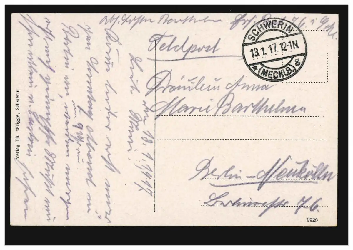 AK Schwerin: Château - Côté ville, poste de champ SCHWERIN (MECKL.) 13.1.1917