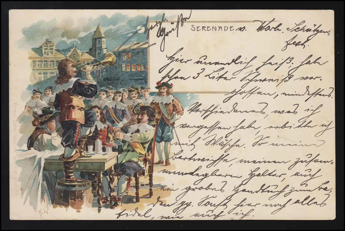 AK Serenade Mousquetaires Soldats Place de Marque Trompeter WARBURG/ PADERBORN 21.7.1900