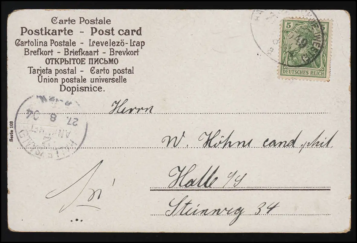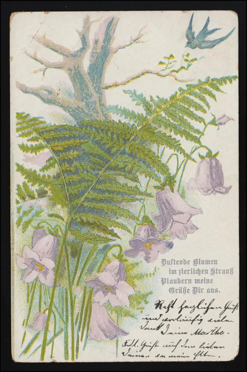 AK Série 103 Fleur de cloche Farn Schwalbe Vers, Bahnpost LÖHNE/ HALLE 27.8.204