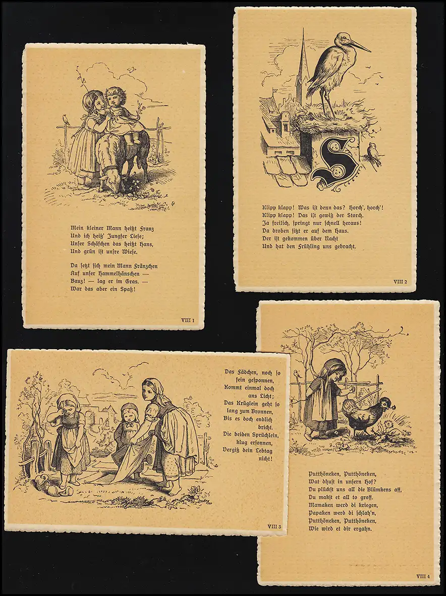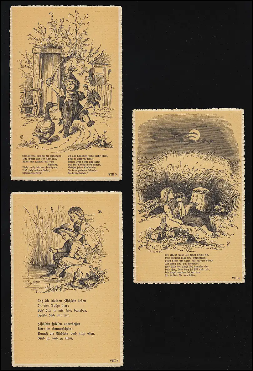 Ensemble complet 10 cartes, artiste Oskar Pletsch, l'un des plus populaires illustrateurs pour enfants du XIXe siècle, édition Hegel & Schade Leipzig. Illustrations signées sur le devant, avec poèmes et vers. Cartes imprimées en couverture avec des ornements Art Nouveau. Toutes les cartes sont inutiles, voir les illustrations. Examen: original Numéro d'article: 00000000020641