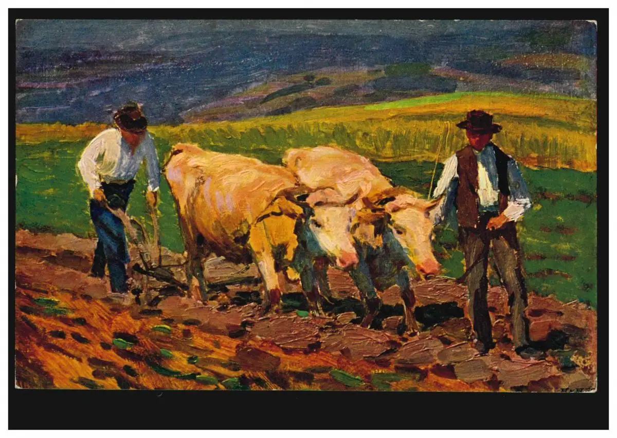 AK V. Maly: Ackern - Enchaîné à bœufs pendant labour, inutilisé, vers 1920