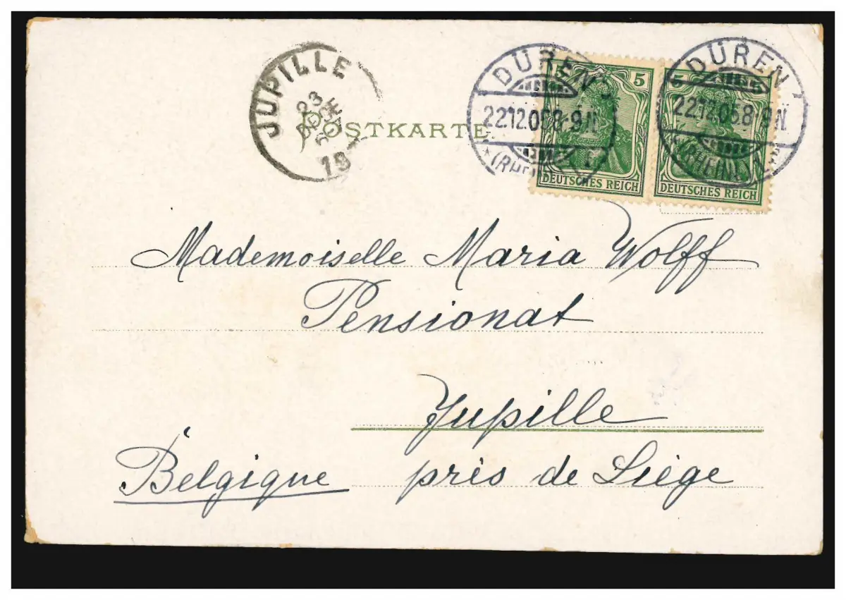 de DUREN (RHEINLAND) 22.12.1905 vers la Belgique, timbre d'arrivée JUPILLE 23.12.05 Vérification: original Référence produit: 00000000037813