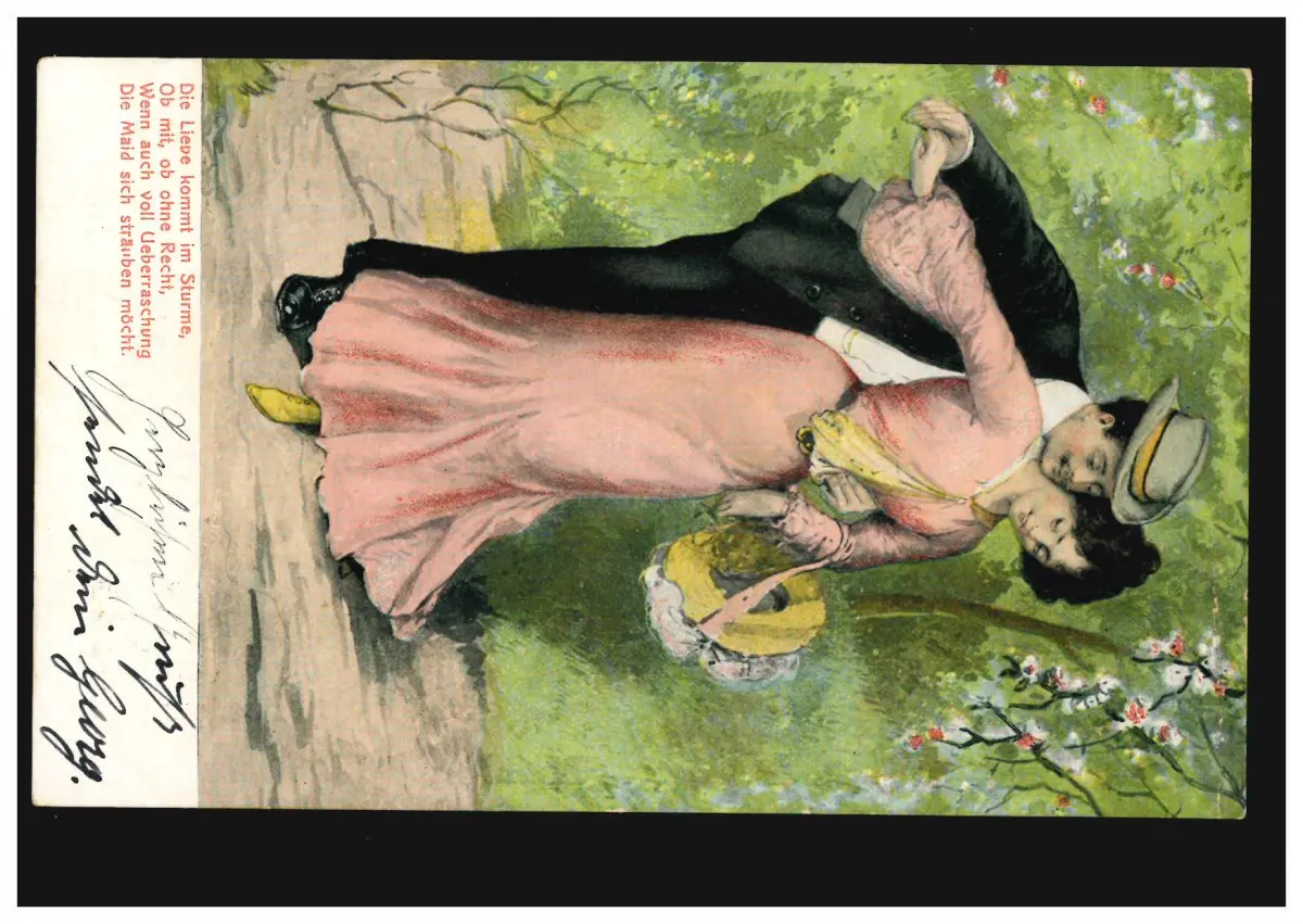 AK couple d'amour dans la forêt, poème: L'Amour vient dans l'orage, ... HAMBURG 17.8.194