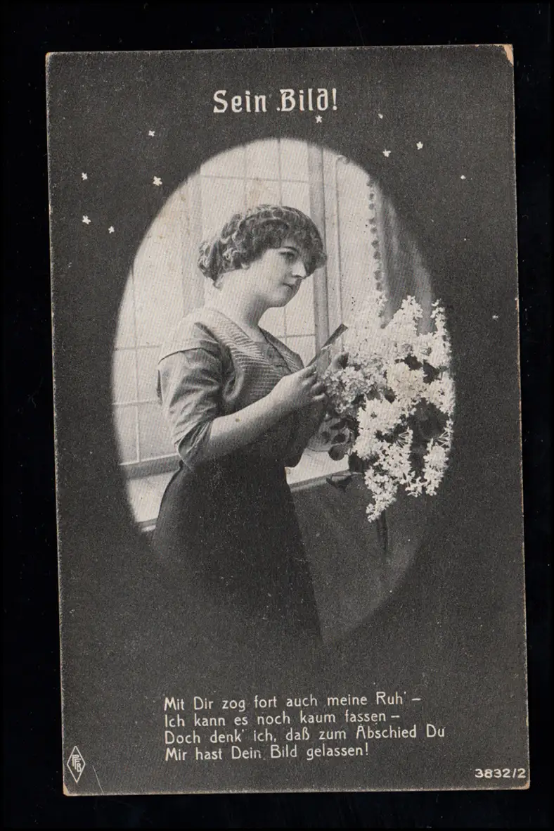 AK de l'amour: Son image! Femme avec image et fleurs à la fenêtre, M.GLADBACH 12.5.1916
