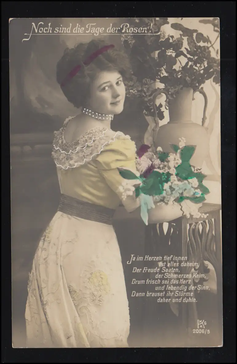 AK de mode jours de roses - femme avec cruche de fleurs, colorée, ESSLINGEN 17.7.1911